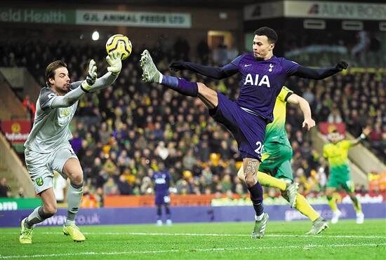 热刺队球员阿里(右)与诺维奇队门将克鲁尔拼抢 新华社发
