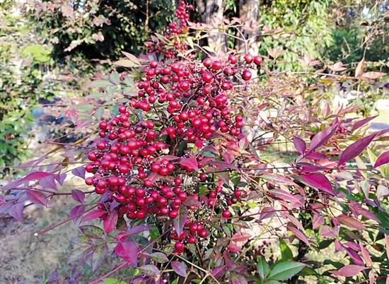 但南天竹是有毒植物。每年5-11月是南天竹的果期。浆果球形,初为绿色,慢慢变为红棕色,最后在萧瑟的秋冬里红艳艳、沉甸甸地垂挂枝头。南天竹的果实宿存时间能长达半年之久,夺目的红果子虽有毒,鸟却能食,趁机将扁圆形种子传播到遥远他乡。人却不能生食此果,只有经加工后,它才是镇咳良药。此外,南天竹的根、叶也具有强筋活络,消炎解毒之效。