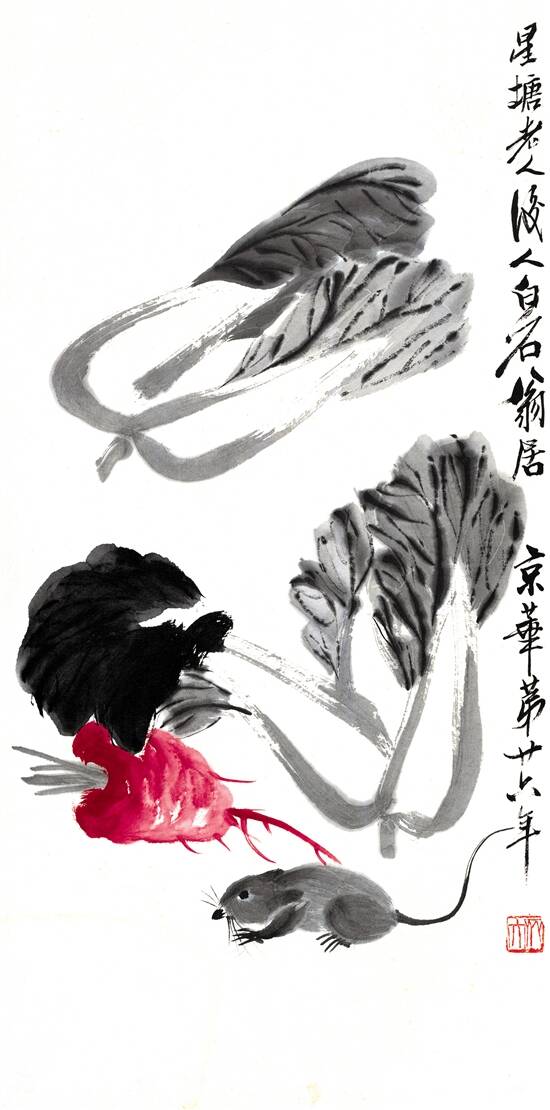 本次展览还展出了一套齐白石所绘的《十二生肖联屏》(左图为《十二生肖:墨鼠》)。该作品或是现在仅存的一套齐白石所画的完整十二生肖图,格外珍贵。