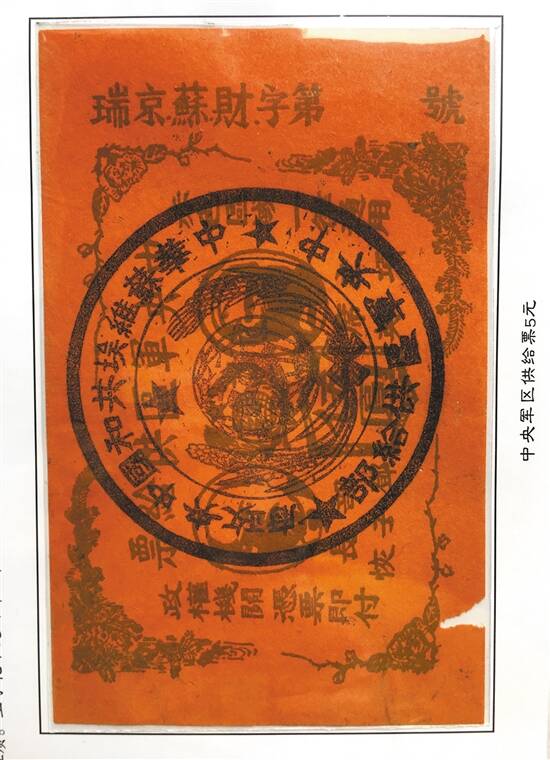 依照苏维埃政策,红军伤残人士受到特殊照顾,所以曾素贤向项英申请了用军区供应票兑换国币的要求,项英体恤伤员,向兴国县苏维埃政府军事财政部写了便信,由于战事激烈,在落款上只写了11月无法确定具体日期。国民党军1934年11月10日占领瑞金,曾素贤无法去兴国兑换两张供给票(一张5元,一张1元),在战火中遗失一张(1元),冒着生命危险保留下了五元一张(见下图)和项英亲笔信,此两件红色文物当年虽未兑现,85年后市值上升以万倍计,项英亲笔留存极少,极其珍贵。(符春晓)