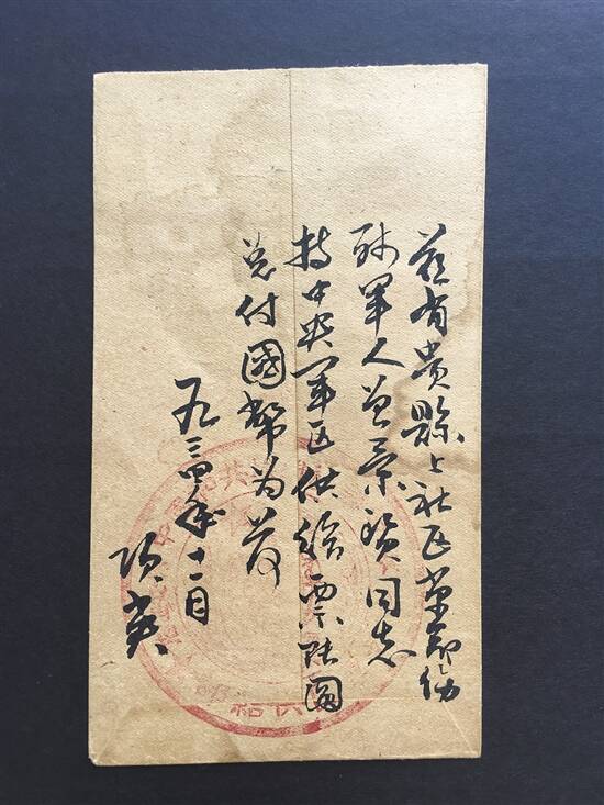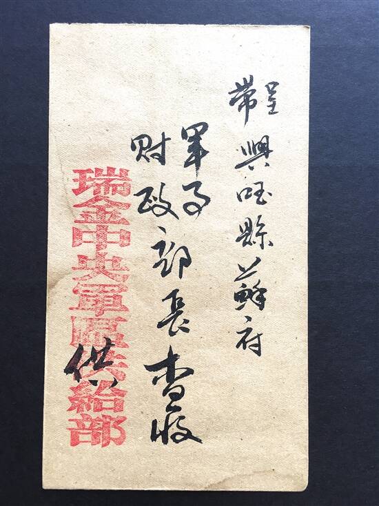 这是一封苏维埃共和国政府副主席项英(主席为毛泽东)1934年11月写给红军伤残军人曾素贤关于兑换国币的亲笔信。信封面16字封背44字,由项英签名,加盖“中华苏维埃共和国中央政府·中央军区供给部”大印印章。