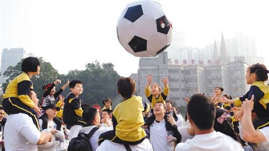 1月4日,在广州市第三中学的绿茵操场上传出阵阵欢呼加油声,此起彼伏。广州市越秀区云台里幼儿园的孩子们在足球场上做游戏,进行足球对抗比赛,“广州市足球协会幼儿足球共迎新年联欢汇”活动在这里举行。