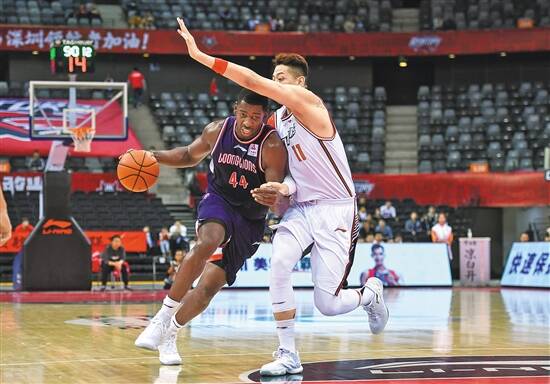 深圳队球员沈梓捷(右)在比赛中防守广州队球员尼科尔森新华社发