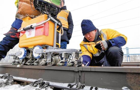 ▲中国铁路沈阳局集团有限公司长春工务段的“探伤工人”正在像B超医生一般,利用超声波探伤仪等仪器对铁路钢轨进行“体检”,检查是否存在肉眼瞧不出的“疑难杂症” (新华社 许畅 摄)