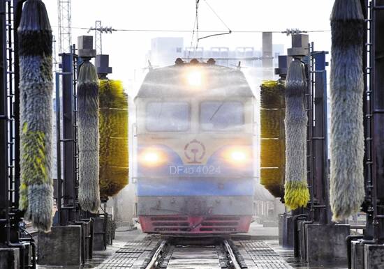 ▲中国铁路南宁局集团有限公司柳州机务段的“火车4S店”通宵忙碌,火车机车正通过一套自动清洗设备 (新华社 黎寒池 摄)