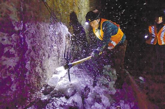 ▲ 太原工务段佛峪桥隧工区的“打冰人”在隧道里打冰。他们每年10月底到第二年春天,主要工作就是对20余条隧道的200多处结冰隐患点进行排查、处理,而每次出巡通常都要步行超过12公里(新华社 曹阳 摄)