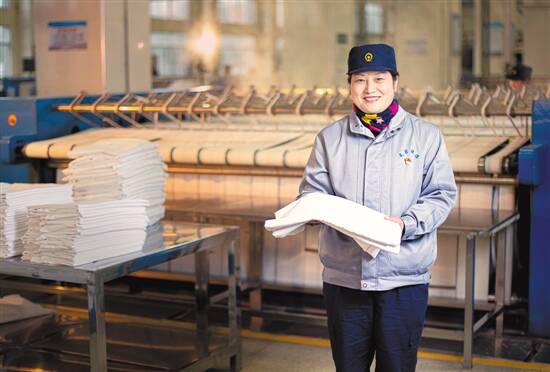 ▲在武汉客运段洗涤中心内,卧具洗涤员会把所有送来的卧具洗涤得干干净净,熨烫得平平整整,只为让旅客都能乘坐干净舒适的火车回家 (新华社 熊琦 摄)