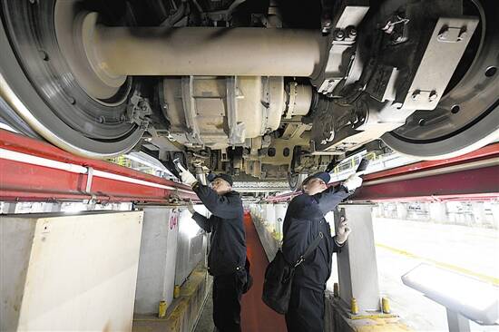 机械师们在提前检修动车组列车的各组件安全 (新华社 杨文斌 摄) ▲