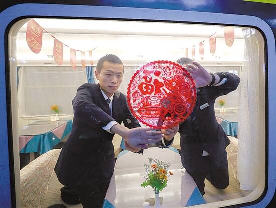 ▲重庆西站K4673次列车上的乘务员,在旅客上车前贴好了喜庆的窗花 (新华社 黄伟 摄)
