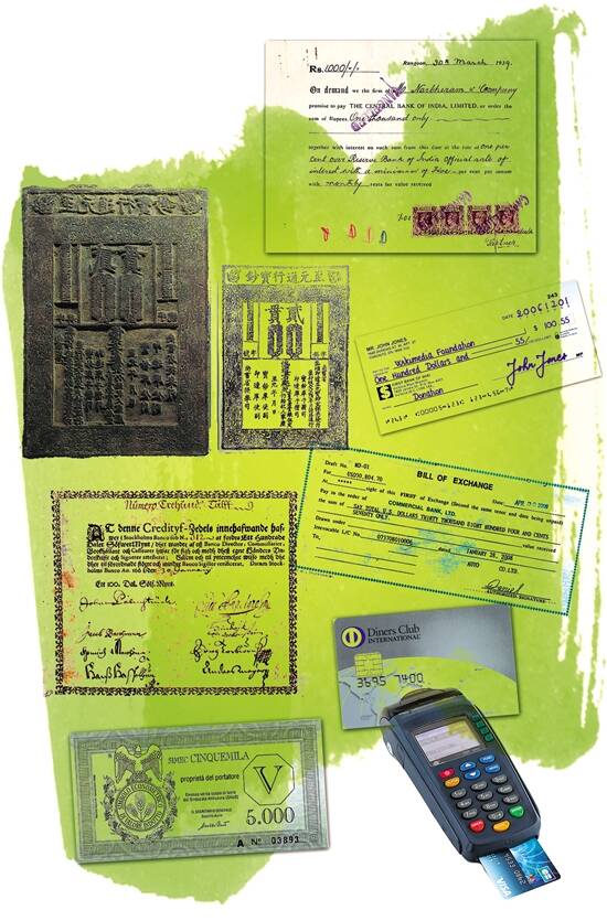 ▲1939年缅甸仰光一家公司开出的本票 ▲中国元朝的纸币及印模 ▲支票样本 ▲汇票样本 ▲1666年瑞典斯德哥尔摩银行发行的纸币 ◀大来卡 ▲吉亚琴托·奥利蒂发行的私人货币斯美克 用维萨信用卡在POS机上支付▶