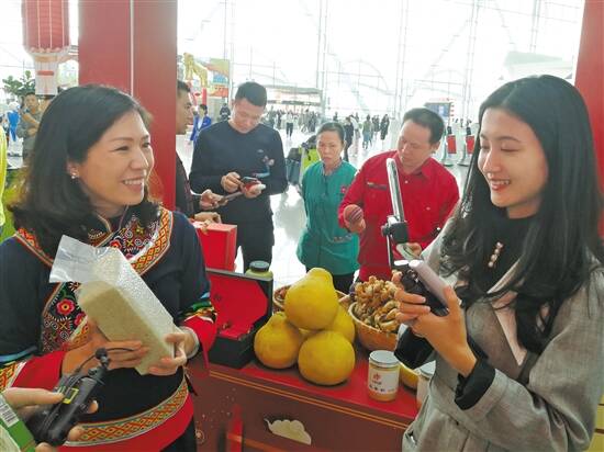▲ “粤陕好年货 飞进千万家”活动现场,广东连山壮族瑶族自治县县长冯红云直播推介连山优质农产品 许悦 摄