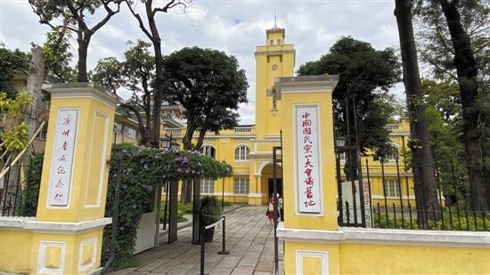 从1684年开始,这一带就是举行广东乡试的广州贡院所在地,康有为、梁启超就是在此中了举人,中图至今保留的那一段斑驳“龙虎墙”(当年贡院用于张贴广东乡试榜单的一堵老墙)上,或曾有过他们的名姓。随着清末废除科举,此间历经两广速成师范馆、两广优级师范学堂等新式教育阶段,办学不辍。1906年学校建起了标志性的钟楼和东、西堂。1923年孙中山平定陈炯明叛乱回到广州时,它已更名为广东高等师范学校,中山先生多次来到钟楼礼堂发表革命演讲。1924年,他颁布大元帅令,将该校和广东省立法政大学、广东公立农业专门学校一同组建广东大学(1926年正式更名为中山大学,沿用至今)。1924年,国民党第一次全国代表大会也在这个礼堂召开,孙中山、李大钊、毛泽东等人济济一堂,开创历史。