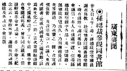 今日的广东省立中山图书馆(以下简称“中图”),是目前全国大型公共图书馆中唯一有“中山”二字冠名的,这自然是为了纪念——广东是孙中山的故乡,且民国时期的“广州市立中山图书馆”为该馆源流之一。但一直以来,没有任何文献或史料记载能够证实中山先生曾到过这里。虽然这座华南最早的现代公共图书馆,在民国初建的1912年便已创立。几乎正好距今99年前,1921年1月19日,新加坡《新国民日报》在第六版“广东要闻”头条刊登了一条消息,标题为“孙总裁参观图书馆”(见上图),讲述中山先生与当时多名粤籍国会议员参观“广雅书院图书馆”一事,还提到馆内“抗风轩”是他青年时与兴中会同志一起图谋革命的“会议场”——这条200余字的小消息,当时就不惹眼,更不用说还经历了一个世纪的岁月尘掩。