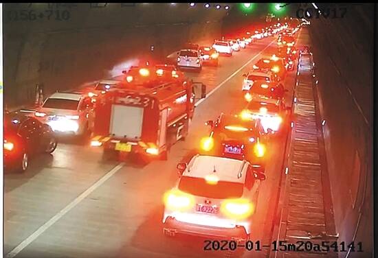 只见隧道内的车辆自觉向两旁45度移动,齐刷刷靠边避让,中间让出了一条通道,原本2公里多的隧道,消防车仅用了4分钟便通过了隧道,顺利到达事故现场。经过12分钟的紧急扑救,两辆小车明火得以扑灭。