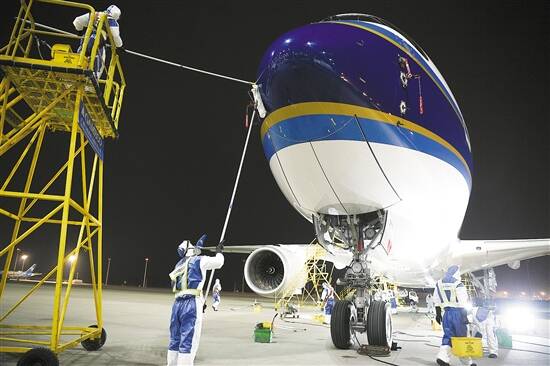 “和人一样,所有飞机在年前都要清洗干净。”GAMECO大修三部综合维修部勤务主任冯信坤介绍,一般来说,南航飞机21天左右清洗一次,春节期间则较特殊,所有飞机都会按“除尘”习俗进行集体清洗。现在正值春运高峰期,每晚清洗飞机约10架,确保年前能把每架飞机都洗得干干净净。