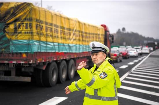 昨日,执勤民警在京港澳高速粤湘两省交界处指挥疏导交通 羊城晚报记者 周巍 摄