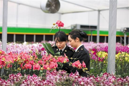 海关关员正在出口蝴蝶兰种植场进行病虫害检测