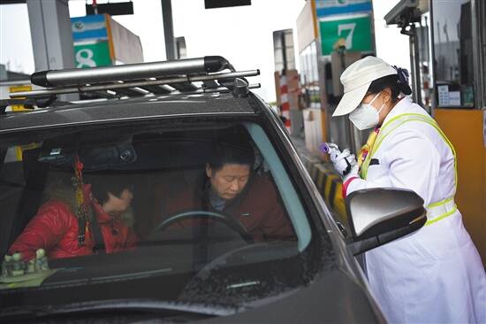26日,机场高速三元里收费站工作人员对过往车辆司乘进行测温 羊城晚报记者 周巍 摄