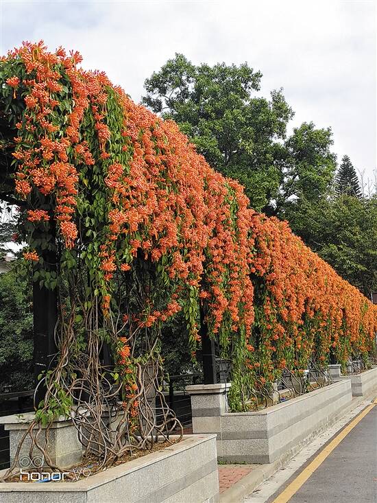 文/周肇基 图/严斯凤炮仗花是紫葳科炮仗花属的多年生常绿攀缘木质藤本植物。其顶生小叶常变为线形3裂的卷须,可依靠卷须攀爬生长达十数米的高空。其花冠橙红色,长约6厘米,筒状。花冠筒从枝条上向外向下弯曲,数朵花构成顶生下垂的圆锥花序,错落有致地分布在植株茎枝上、叶丛中间。至盛花时节,炮仗花开得满树、满棚、满架、满墙,仿若一串串喜庆的鞭炮,故有“炮仗花”美称。此外,它还有鞭炮花、火把花、火焰藤等别名。