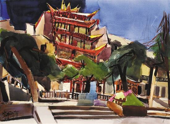 从陕北老汉到新疆边民,从苏州园林到全国各地的村落,还有国外写生的异域之景……廖定标的水彩画创作内容都来自写生,但他所描绘的并不是“眼中之景”,独特的构图与视角、错落有致的线条、恰到好处的设色,构成他用水彩营造的“心象之国”。