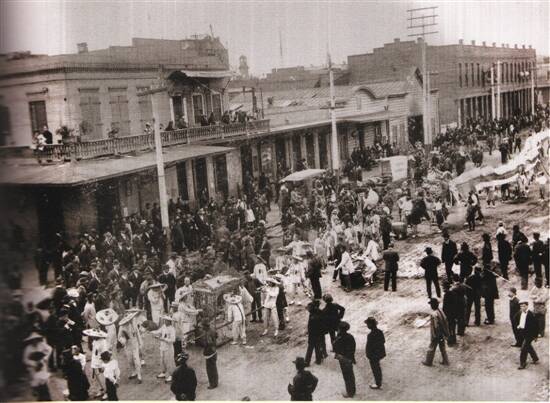 加州媒体在报道1852年7月4日国庆游行时,对中国人的游行队伍做了浓墨重彩的描述:“游行以我们所见过的最独特、最隆重的中国人的表演结束了。现场每一个人都被这些新来的市民的热情和狂热所震惊。一面巨大的红色丝绸旗打头阵,旗杆至少有四十英尺长,后面是龙头和龙身,四十八个穿着亮丽服饰的中国人手持扇子紧跟其后。接着是一面写着‘旧金山的中国人’的大旗,一支用锣、钹和铜鼓演奏的乐队在行进中演奏着天朝音乐。四个看上去很有身份的中国人穿着飘逸的长袍坐在马车上,还有七十六个中国人身穿长袍头戴白色流苏帽。还有一条横幅上写着‘奔向共和,中国男孩来了’。这支中国人的游行队伍,人人穿着整洁,文明地展示中国风俗。最后出场的是一辆四轮马车,四个中国人不停地放鞭炮,引得后面跟着的几百个小男孩乐此不疲。”