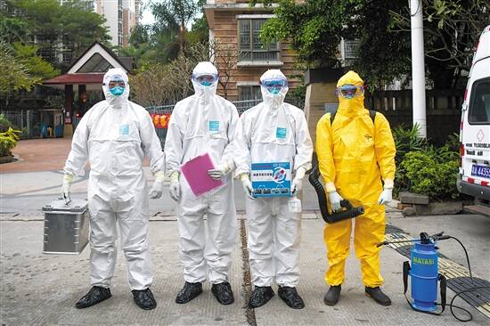 左边三人身着白色防护服,负责“流调”;右边一人身着黄色防护服,负责消杀