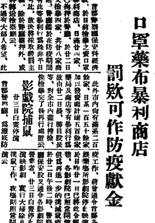 首都警察厅保安科经济股于日前检举之卖口罩暴利商店,日满廿四家,已拘押于警察厅。于廿二日又检举四家,共廿八家商店。警察鉴于防疫期间,此等暴利殊非平日可比,故决将采取严罚主义,除于警厅拘押外,或将转送检察厅。不过,有大部分人希望,此等罚金应充防疫献金。