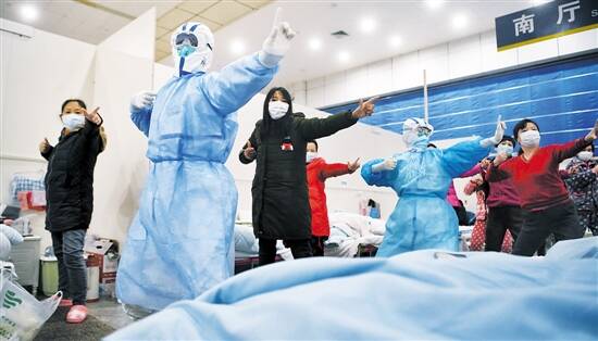 江汉方舱医院内,医护人员带领患者打八段锦 羊城晚报特派武汉记者 汤铭明 摄