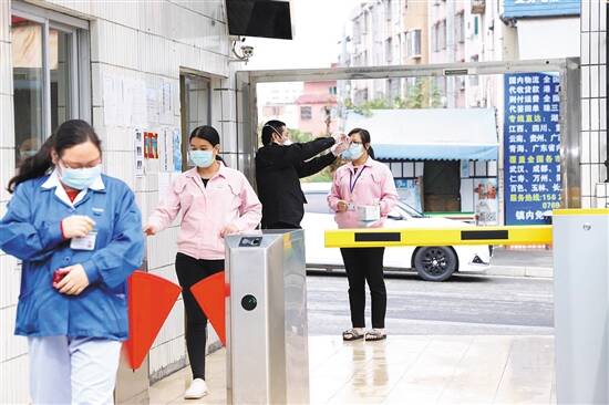 进厂前为员工测量体温成为复工企业的“每日必需” 羊城晚报记者 秦小辉 摄