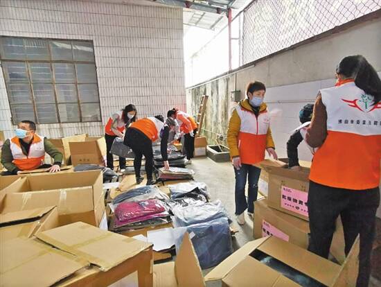 团广东省委、广东省志愿者行动指导中心组织志愿者完成爱心企业捐赠的羽绒服分拣、打包、寄送等工作 岳青 摄