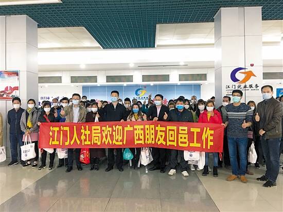 江门市人社局表示,江门加强与桂、川、滇南等劳动力输出地沟通对接。对于返岗务工人员比较集中的地方,持续通过组织包车、高铁专列等方式为用工紧缺的重点企业提供“点对点”的“返岗直通车”,集中接回务工人员。