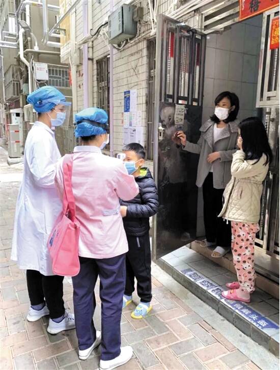 整理好物品,我和同事背着出诊包在社区民警和工作站人员的协助下,开始了上门探访的行程。巴登村和埔尾村是城中村,外来人口众多、出租屋密集,没有电梯。我们逐一敲开每户人家的门,认真询问和监测体温,交代注意事项,居民都很配合。