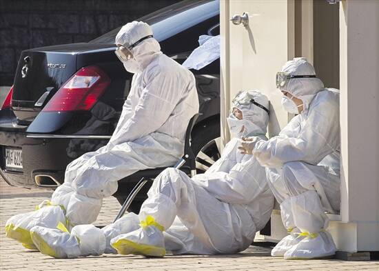 3月5日,在韩国大邱世界杯体育场,医疗队工作人员坐在地上休息 新华社发