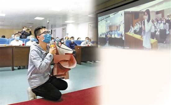 家属们和准家属们的到来,将视频连线推向高潮。轮到与自己的女友、驰援武汉医疗队员、佛山市二医院CCU护士许春玲视频连线时,该院人事科的王嘉宁对着镜头,单膝下跪求婚。