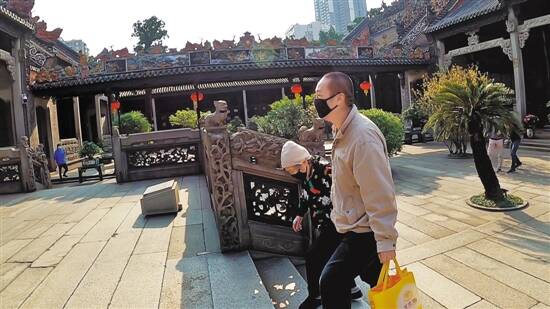 9时05分,家住海珠区的陈先生带着83岁的妈妈黄婆婆来到陈家祠,经过安检、体温检测后,走进了陈家祠的大门。这是陈家祠受新冠肺炎疫情影响于1月24日闭馆后,第一次接待的两位观众。