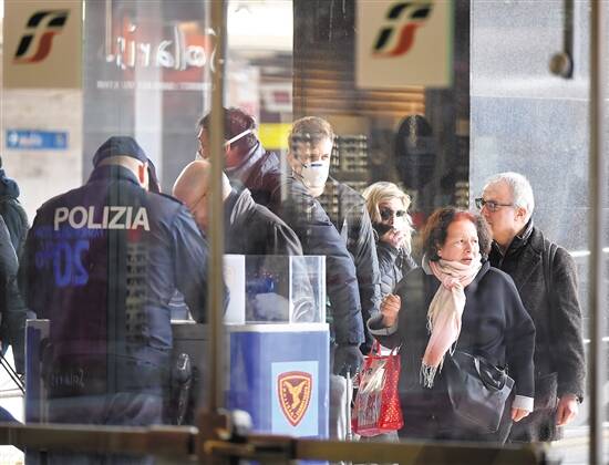 9日,在罗马泰尔米尼火车站,警察询问旅客出行信息 新华社发
