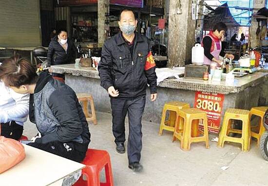 叶秀丰(右)在农贸市场值守