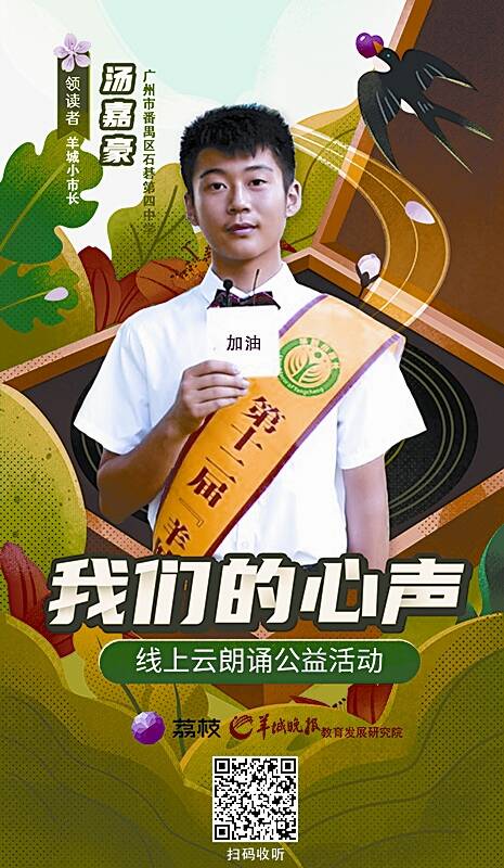 自疫情暴发以来,社会各界人士积极响应,共抗疫情。为了让广大青少年在家里积极响应抗疫号召的同时,能用年轻一代极具生命力的声音传递爱与正能量,用声音表达自己与大家同舟共济的情怀,羊城晚报教育发展研究院联合荔枝APP共同举办“我们的心声”线上云朗诵公益活动少年儿童专场,与广大学子携手,以云朗诵的形式为战“疫”发声。