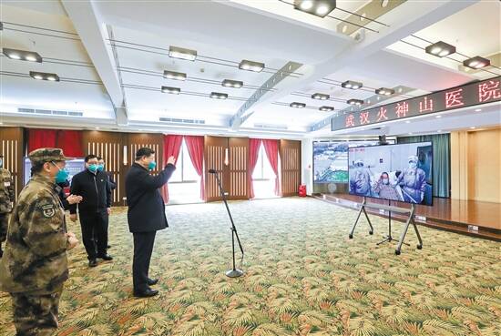 在火神山医院指挥中心,习近平听取医院建设运行、患者收治、医务人员防护保障、科研攻关等情况介绍。习近平指出,疫情发生以来,包括军队在内的广大医务工作者发扬特别能吃苦、特别能战斗的精神,义无反顾奔赴湖北和武汉,毫无畏惧投入防控救治工作,日夜奋战,舍生忘死,不负重托,不辱使命,同时间赛跑,与病魔较量,为武汉疫情防控工作作出了重要贡献。军队医务人员牢记我军宗旨,召之即来,来之能战,战之能胜,为党旗、军旗增添了光彩。沧海横流,方显英雄本色。你们真正做到了救死扶伤、大爱无疆。你们是光明的使者、希望的使者,是最美的天使,是真正的英雄!党和人民感谢你们!