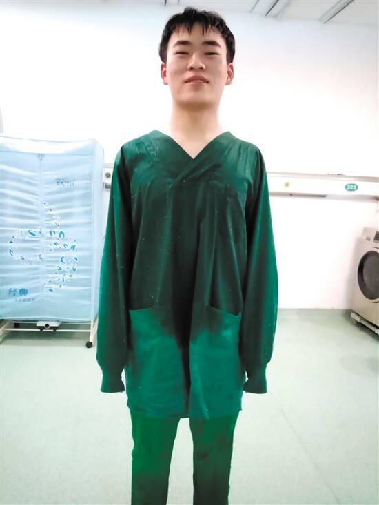 我是男生,也是科室最年轻的护士,有体力优势,所以重活脏活理所当然要揽下来。穿着密不透风的防护服,脚上还要套上笨重的长筒雨靴,整身防护装备加起来有近十斤重。病人最多时,每天要拖六层楼的地,加起来超过100间病房,所以我经常开玩笑说,我可以表演雨靴倒汗水的绝技。同班的女护士也拿我开涮,说我是“流水的消杀组,铁打的李珂澜”。这点,我还是有点小骄傲的。