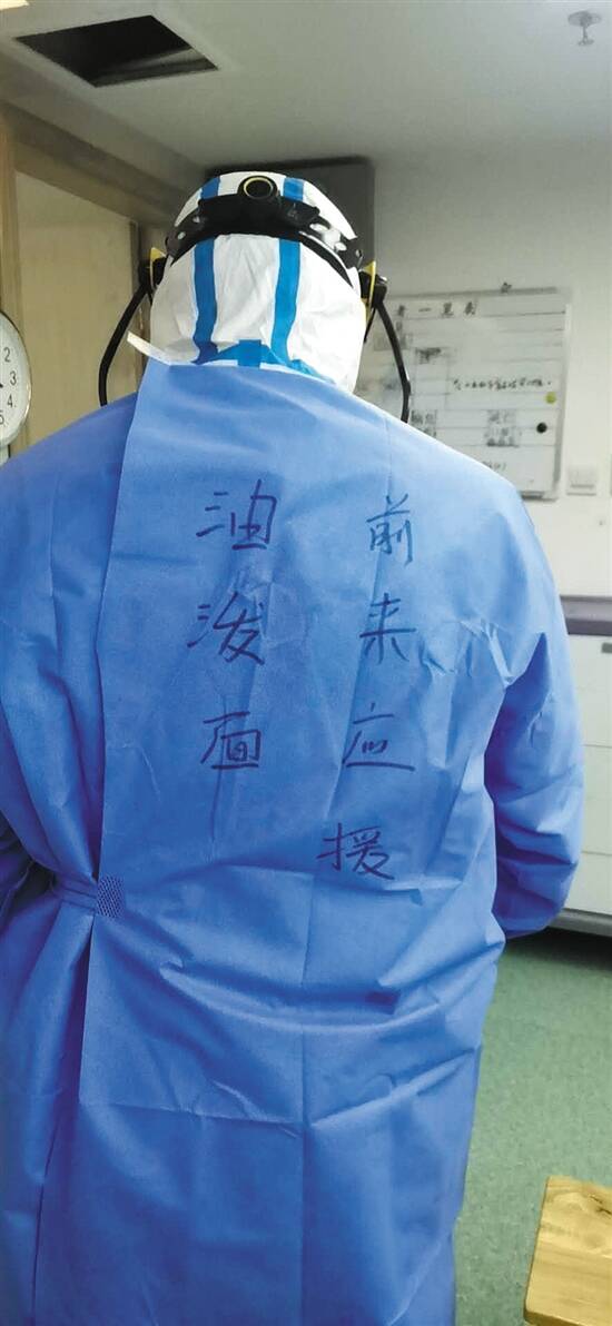 “白切鸡,别怕,油泼面前来应援!”每天进入隔离病房前,我都会让同事在自己的隔离服上写下一段逗趣的话语(见下图),这也算是一天繁重工作前的自我消遣和鼓励。我今年21岁,去年刚毕业,从老家陕西来到佛山工作,“有幸”成为全校同届毕业生中唯一一个上过“战场”的人。