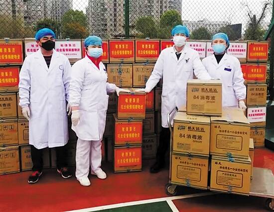 2月11日,敏捷集团捐赠的第三批紧缺医疗物资5000箱、总重76吨的84消毒液送抵湖北黄冈七家定点救治医院。