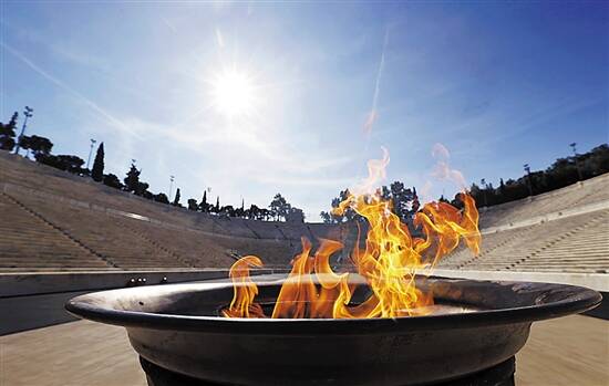 刚点燃不久就被暂停传递,奥运圣火被保存在泛雅典娜体育场 图/视觉中国