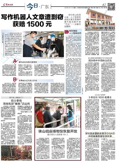 文/羊城晚报记者 林园人工智能生成的诗歌、新闻作品、图画等,是否享有著作权?近日,深圳南山法院审结深圳市腾讯计算机系统有限公司诉上海盈讯科技有限公司侵害著作权及不正当竞争纠纷一案。法院认定,这篇由新闻写作机器人生成的涉案文章属于我国著作权法所保护的文字作品,判定被告侵害了原告享有的信息网络传播权,应承担相应的民事责任。据了解,这是全国首例认定人工智能生成的文章构成作品案件。