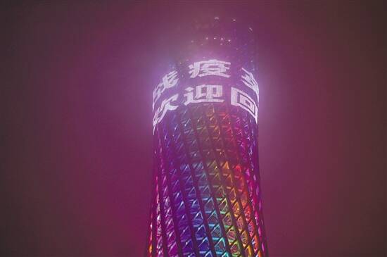 3月20日晚,广州塔、花城广场等地大屏幕滚动播放欢迎广东援湖北医疗队归来的灯光秀,迎接英雄回家 羊城晚报记者 周巍 实习生 惠天骄 摄