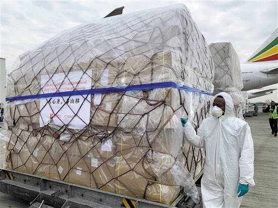 历时10小时飞行,满载着来自中国抗疫物资的埃航货运包机22日上午抵达埃塞俄比亚首都亚的斯亚贝巴的国际机场,这是马云公益基金会和阿里巴巴公益基金会捐赠非洲的部分医疗物资,用于支援非洲54国抗击疫情。据悉,这批物资包括540万只口罩、108万套试剂盒、4万套防护服和6万个防护面罩,将平均分配给54个非洲国家。抗疫物资的包装上写着南非已故前总统曼德拉的名句,附上的中文翻译则使用了中国谚语“人心齐,泰山移”。