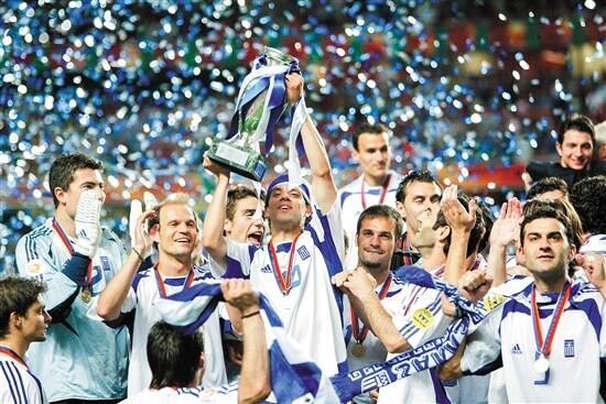 在欧洲杯历史上以弱胜强,爆出惊天大冷门捧杯的有两次,第一次是“童话”,第二次是“神话”。2004年在葡萄牙举行的第12届欧洲杯就诞生了不朽的“希腊神话”——希腊国家男足队爆出惊天大冷门,他们掀翻了所有的欧洲足球巨人,最终捧得德劳内杯。此前,希腊仅参加过一届世界杯,3战皆负,0进球、失10球,1980年参加欧洲杯战绩仅1平2负,这次仅是第二次跻身欧洲杯决赛圈,赛前夺冠赔率为1赔80。被分在A组的希腊小组赛首轮就爆出冷门,以2比1力克东道主葡萄牙。不过此后两轮希腊以1比1战平西班牙、以1比2不敌俄罗斯,凭借比西班牙多2个进球,惊险晋级。1/4决赛希腊爆冷以1比0淘汰大热门法国。半决赛希腊遭遇4战皆胜的捷克,最终在加时赛的第15分钟,希腊利用角球机会由德拉斯抢前点头球破门,气走表现极佳的对手。决赛,希腊再战东道主葡萄牙,已打出信心和士气的希腊已无法阻挡,凭借着查里斯特亚斯的头球破门,最终希腊登上欧洲之巅。