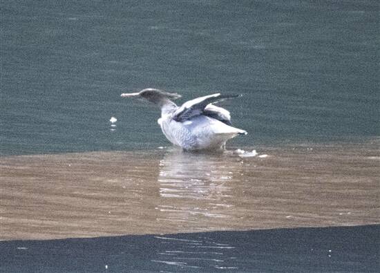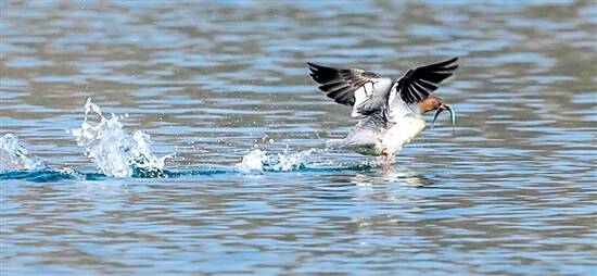 最近两年,笔者深入到漳河水域,追踪拍摄在此越冬的中华秋沙鸭的各种生态。通过观察发现,在此地栖息的中华秋沙鸭大约有200多只,它们习惯于聚群活动,但从不与其他野鸭合群,生活富有规律:清晨和傍晚,是中华秋沙鸭觅食的时间,它们喜欢在河汊游动,潜水捕食鱼虾;中午,会选择在阳光充足的沙滩或岩石晒太阳;晚间,便聚集在水中孤岛上的芦苇丛中休息。