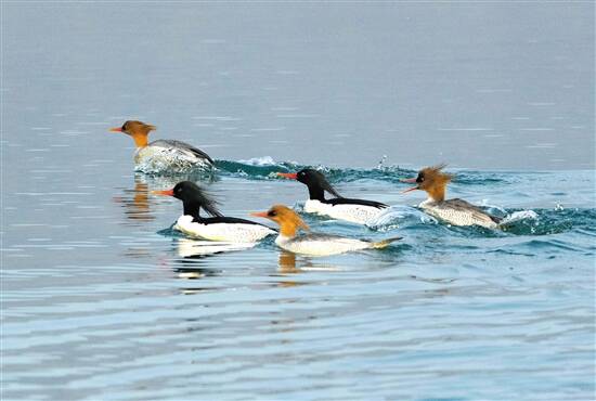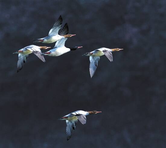 中华秋沙鸭非常警觉,每当群聚活动和晚上休息时,总会派出哨鸭站在远处四面观察,一旦发现风吹草动,便向同伴发出紧急逃离信号,于是,成群的鸭子就一只接一只地从水面迅速滑翔起飞,形成一条颇为好看的直线,壮观极了。