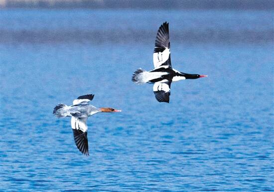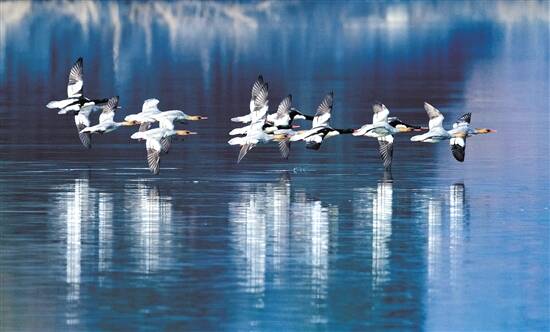 中华秋沙鸭是大自然中的瑰宝,也是生态环境的风向标,哪里生态环境好,它就在哪里栖息安家。它们选择越冬的漳河流域,自古就是长江中游的一条较大的支流河。60多年前,人们在漳河兴修水利蓄水防洪,建成了漳河水库,成为江汉平原与鄂中西部交会处最大的人工湖泊。今天的漳河水库被辟为国家级湿地公园,水质达国家一类标准,水中生长着各种淡水鱼虾,优异的生态环境,成为中华秋沙鸭聚集最多的越冬之地。